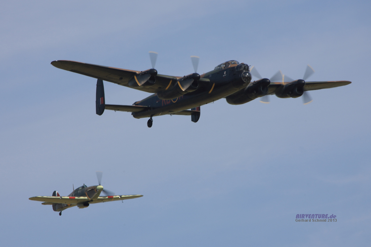Hier werden die Ausmaße der Avro Lancaster deutlich. Die Spannweite beträgt mit 31 Metern fast das Zweieinhalbfache der begleitenden Hurricane. Das maximale Abfluggewicht ist annähernd zehnmal so groß. |