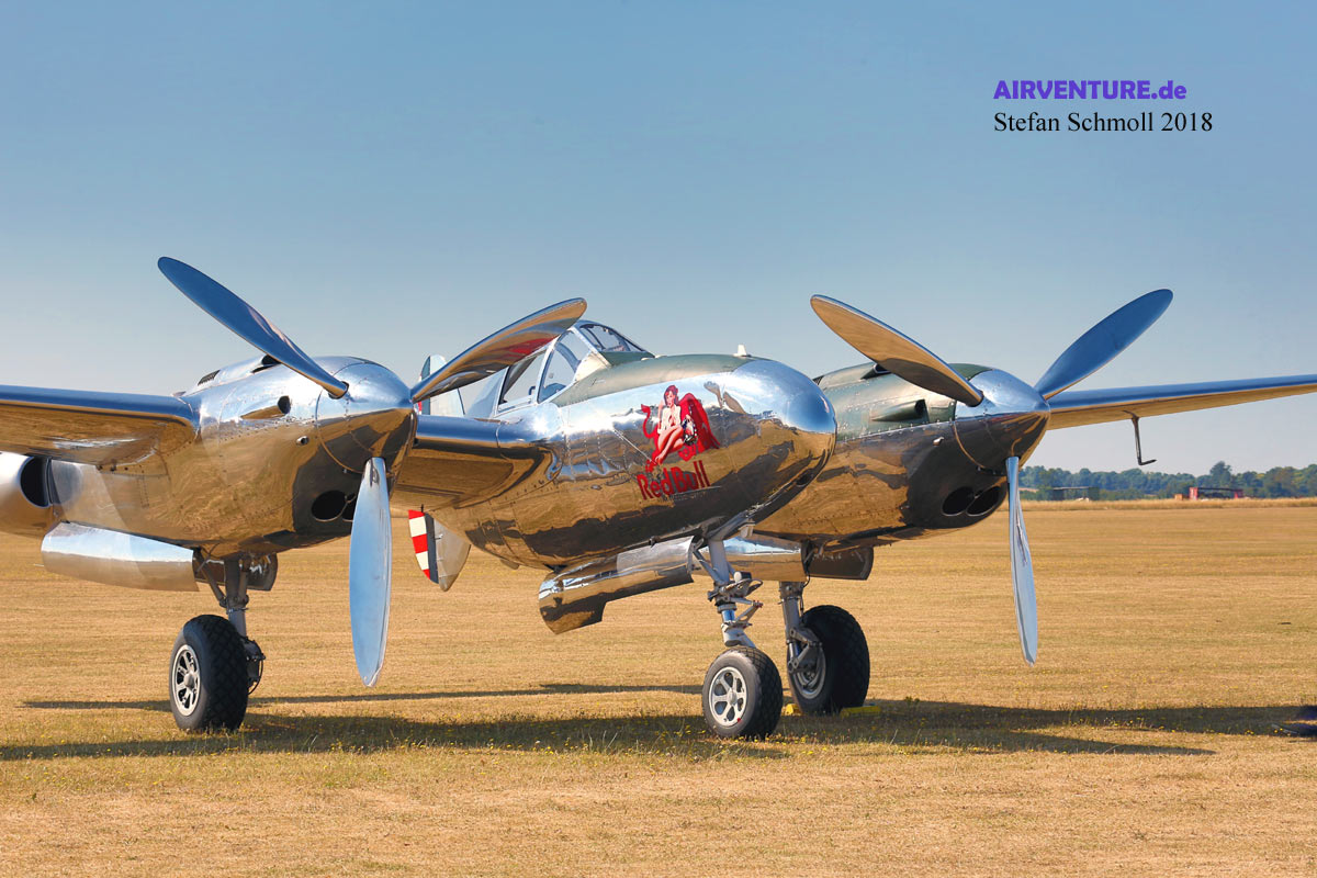 Die Flying Bulls sind mit großer Besetzung angereist. Neben DC-6 und Vought Corsair kam natürlich auch der "Gabelschwanzteufel" - die Lockheed P-38 nach Duxford. |