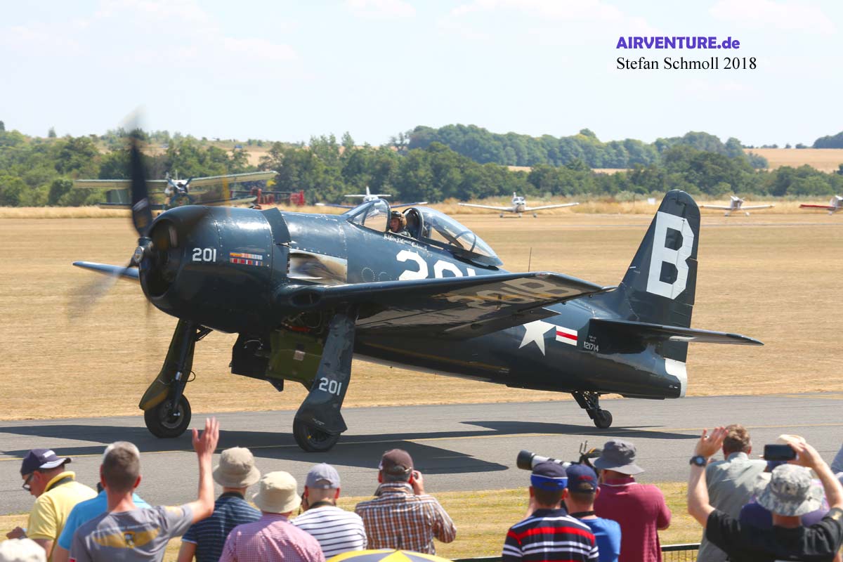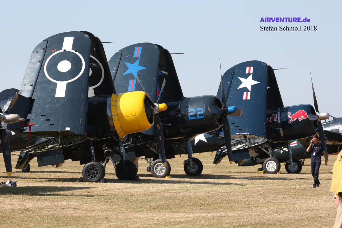 Gleich drei Vought Corsair waren vertreten. Neben der hier beheimateten G-FGID kam die frisch restaurierte F-AZEG aus La Ferté Alais und OE-EAS der Flying Bulls flog aus Salzburg ein. |