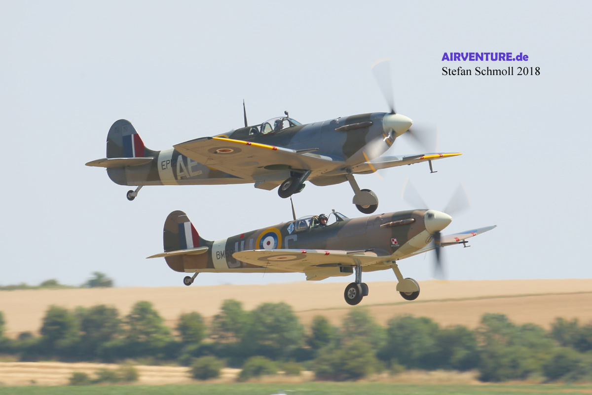 15! Spitfire waren bei Flying Legends 2018 gelistet. Darunter waren mehrere der vor wenigen Jahren aus Wracks aufgebauten frühen MK.I. Einige nahmen tatsächlich an der Luftschlacht um England teil - doch dazu später mehr. |
