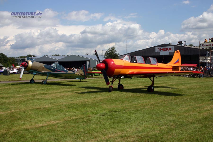 Die wohl weiteste Anreise aller Yaks hatte dieses Exemplar aus Rumänien. Wie man sieht, haben nicht alle Yak-52 ein Bugrad. Diese Yak-52TW kommt klassischer daher www.yak52.ro . |