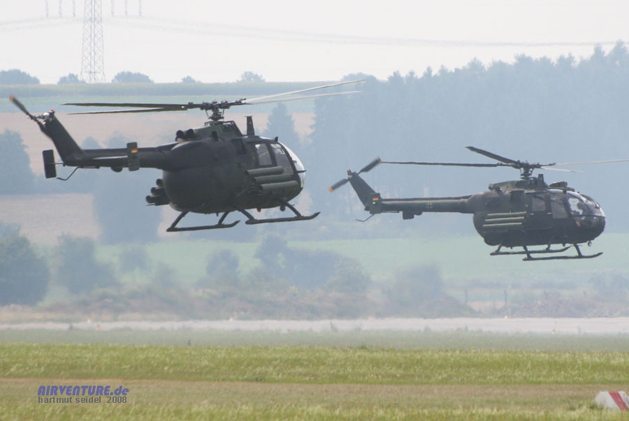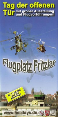 Der Hauptprogrammpunkt im Rahmen der Flugvorführungen beim Tag der offenen Tür am 17. August 2008 auf dem Heeresflugplatz Fritzlar war eine kombinierte Einsatzdemonstration mit insgesamt 9 Hubschraubern, mit der die Errichtung eines "Air Mobile Checkpoint" in einem Kriesengebiet gezeigt wurde. Die Vorführung begann mit dem Abseilen von Soldaten aus einem Transporthubschrauber vom Typ Bell UH-1D. |