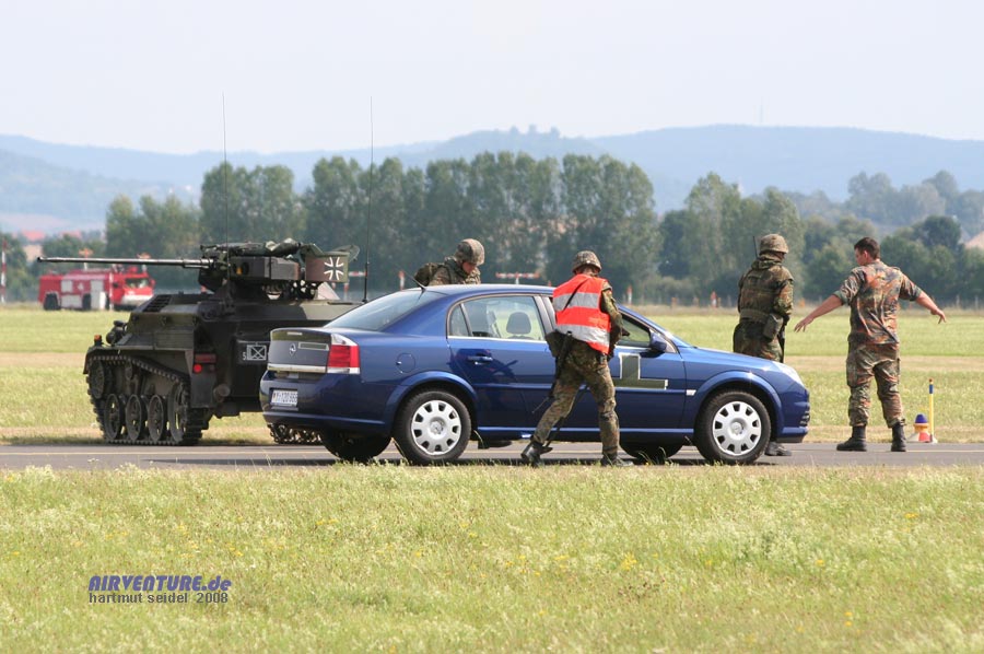 Die Checkpoint-Vorführung beim Tag der offenen Tür in Fritzlar 2008 beinhaltete auch den angenommenen Fall, dass ein verdächtiger Lastwagen, der eventuell Waffen oder Sprengstoff geladen hat, bereits in dem durch den Kontrollpunkt abgesicherten Krisengebiet unterwegs ist. Der Lastwagen wurde von Bo 105 Panzerabwehrhubschraubern gestoppt. Während einer der Bo 105 den LKW in Schach hält, wurden mit einem Bell UH-1D Hubschrauber Soldaten herangebracht, die den LKW durchsucht haben. |