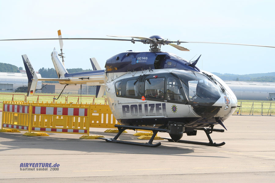 Die Polizeihubschrauberstaffel Hessen hat sich auch mit diesem Eurocopter EC 145 am Static Display des Tages der offenen Tür der Heeresflieger beteiligt. Auf diesem Foto sind übrigens im Hintergrund die beiden großen Luftfahrzeughallen zu erkennen, die im Rahmen der Vorbereitungen auf die Einführung der neuen Kampfhubschrauber vom Typ "Tiger" beim Kampfhubschrauberregiments 36 auf der Südseite des Heeresflugplatz Fritzlar neu gebaut worden sind. |