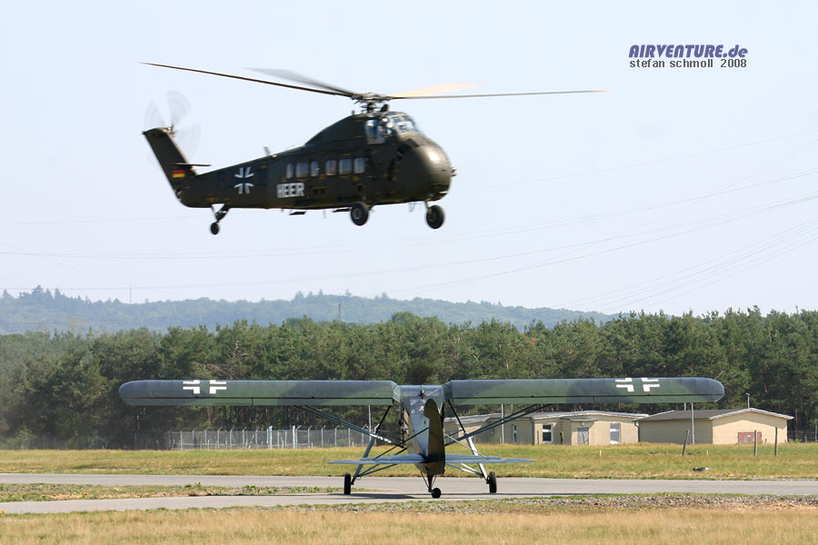 Mit der Sikorsky S-58 von Meravo konnten die Zuschauer in die Luft gehen. Seit einigen Jahren trägt der Hubschrauber - übrigens das einzige noch fliegende Exemplar in Europa - militärische Markierungen der Heeresflieger. Die wertvolle Maschine kam in einem Fernsehfilm über die Hamburger Sturmflut zum Einsatz. |