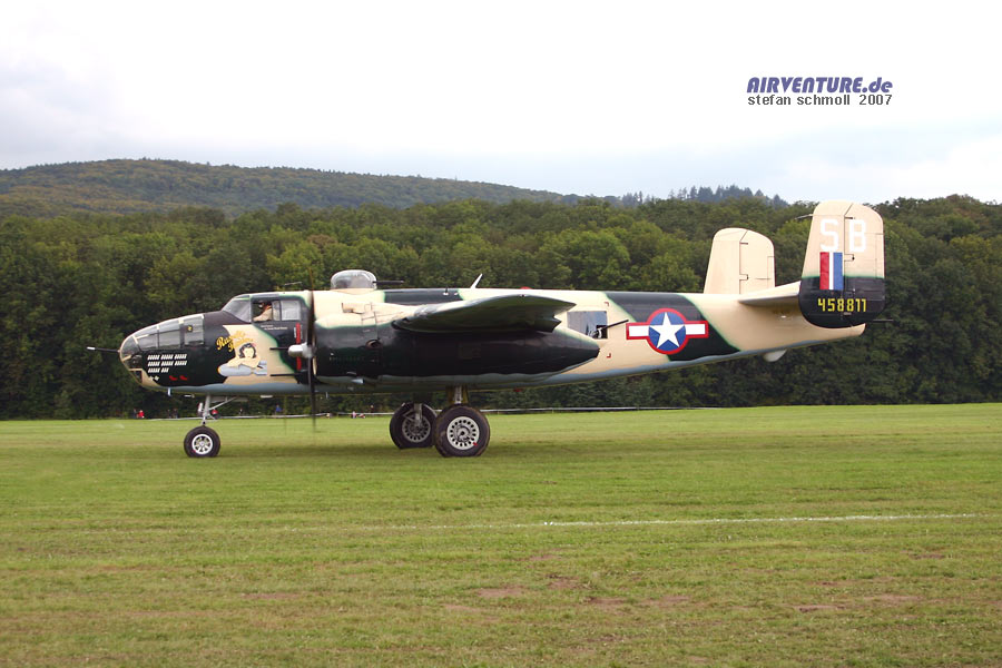 Die North American B-25 aus der Schweiz hatte bereits bei der letzten Veranstaltung ihr schwergewichtiges Debut auf der Graspiste der Hahnweide. Starts und Landungen waren auf dem aufgeweichten Platz in diesem Jahr allerdings eine echte Herausforderung für die Piloten. |