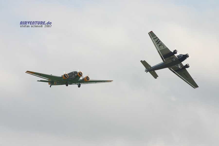 Einen festen Platz haben die Junkers Ju 52 auf der Hahnweide. Während am Freitag bei denkbar ungünstigen Bedingungen wieder FÜNF! Maschinen gemeinsam in der Luft waren, so gab in diesem Jahr auch erstmals an den übrigen Tagen kleinere Formationen. |