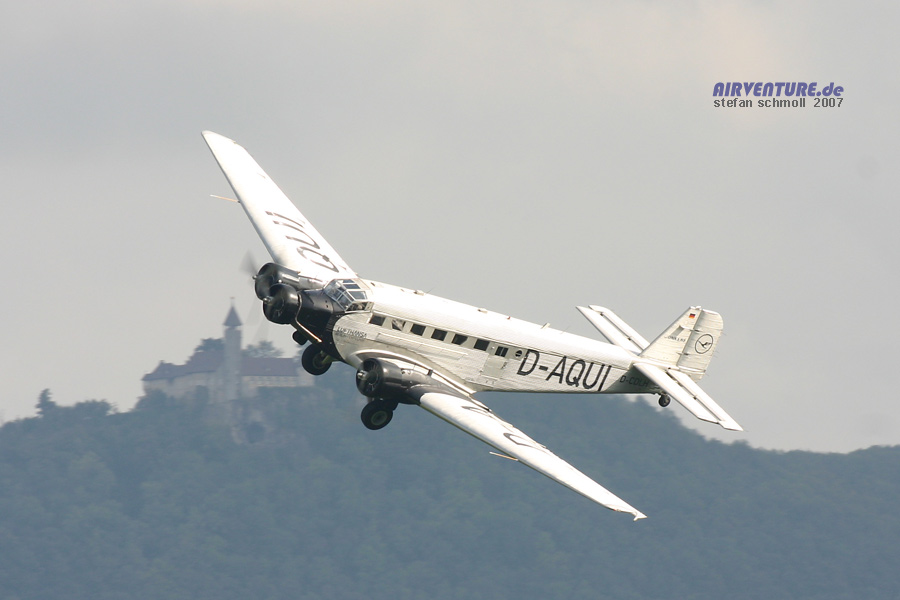 Neben den vier Maschinen der Ju-Air hatte natürlich auch die `D-AQUI´ wieder ihren routinierten Auftritt. Normalerweise werden mit der Maschine ja Passagiere befördert. Aber wenn der Flieger leer ist, kann Chefpilot Uwe Badow richtig aufdrehen und die Wendigkeit der großen Maschine zeigen. |