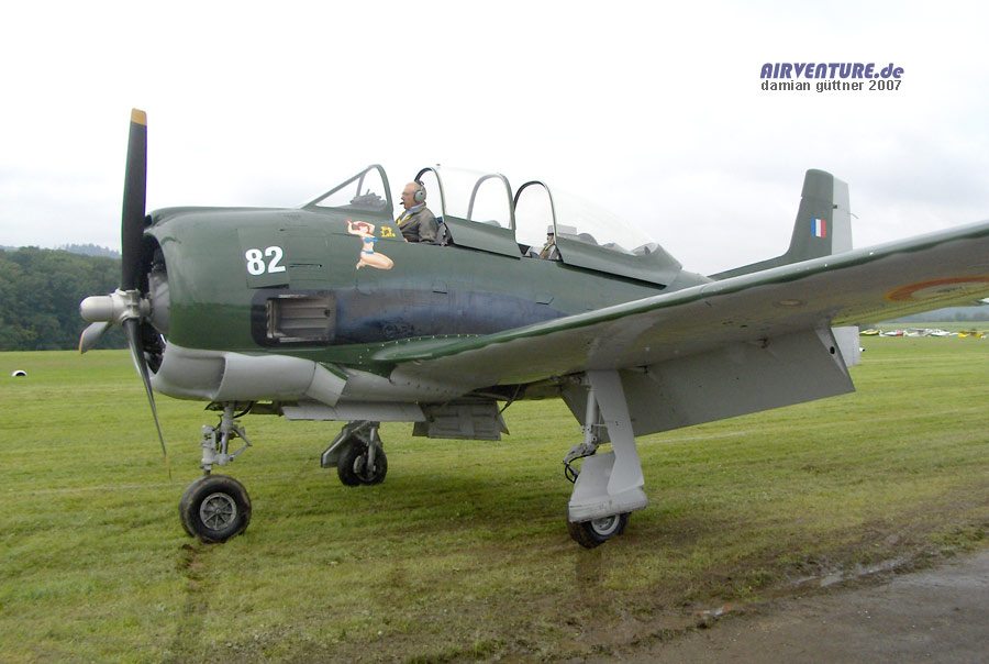 George Kern aus Haguenau führte seine North American T-28 vor. Die Flugeigenschaften gleichen durchaus denen der ausgewachsenen Warbirds am Platze. Natürlich hat die Maschine mit ihrem P&W R-1820 Sternmotor und 1425 PS auch mehr als die doppelte Leistung der Harvard. |