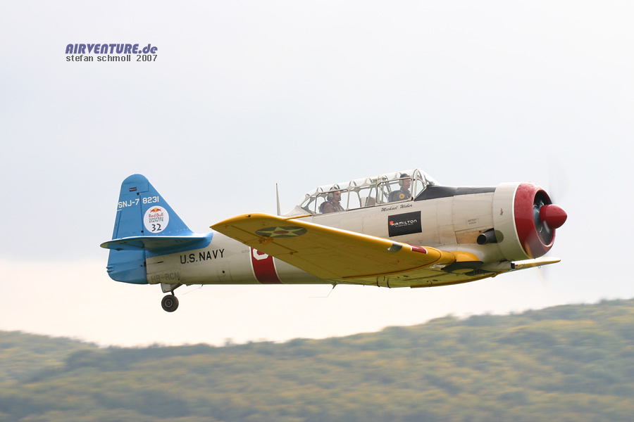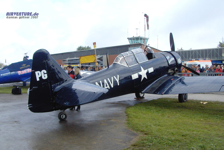 Peter Gutmanns North American T-6 hat sogar eine eigene Homepage: www.missgoosebay.de Auffallend ist der ungewöhnliche Dreiblattpropeller des Trainers.