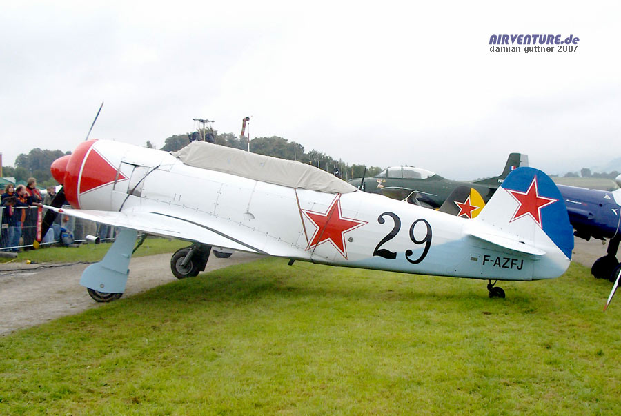 In den Achtziger Jahren wurden in Frankreich etwa 40 Yak-11 aus ägyptischen Beständen von Alain Capel und Jean Salis importiert und flugfähig restauriert. Neben der D-FYAK gehört auch die hier gezeigte F-AZIR zu diesen Maschinen. Beheimatet ist der Trainer von Raymond Capel in La Ferté Alais. |