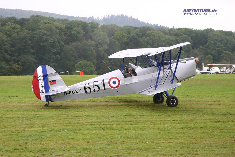 Die Stampe D-EGXY wurde von Hans Schaller geflogen. Der belgische Trainer wurde bis in die sechziger Jahre hinein auch als Kunstflugzeug genutzt ? Qualitäten, welche mit vielen Stampe auch heute noch gerne gezeigt werden. |