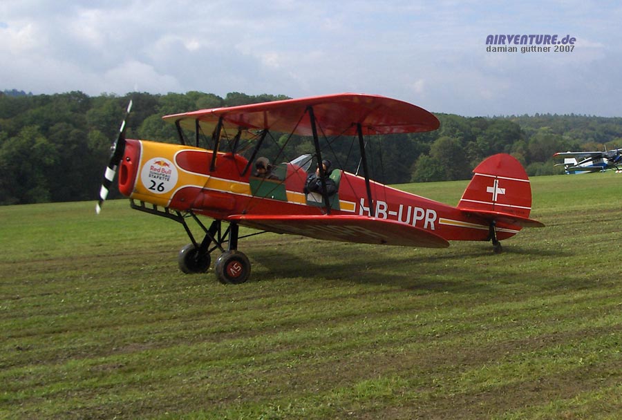 Wetterbedingt konnten einige Teilnehmer aus der Schweiz ? darunter auch Warbirds ? nicht zur Hahnweide gelangen. Aber Andreas Wimmer mit seiner Stampe HB-UPR hatte es geschafft. |