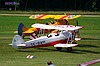 Mit etlichen der im Static Display geparkten Doppeldecker wurde im Flugprogramm des OTT 2009 ein Doppeldecker-Corso gezeigt. Hier stehen gerade Maschinen vom Typ Focke-Wulf FW 44 J Stieglitz, Bücker Jungmann und Boeing Stearman für die Teilnahme an dem Doppeldecker-Corso zum Start bereit. |