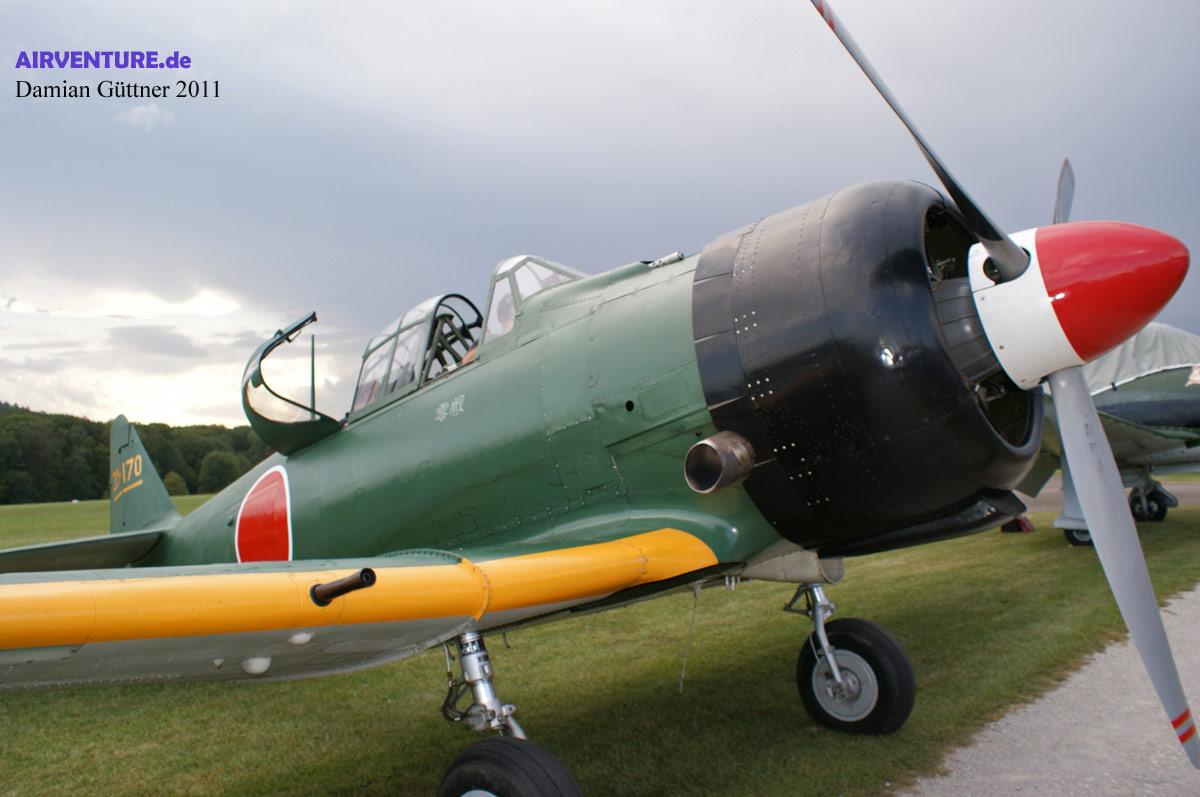 Die F-AZZM war ursprünglich eine AT-6D und wurde in eine Mitsubishi Zero umgebaut. Sie ist bei den an Pfingsten stattfindenden großen Airshows in La Ferté Alais immer gerne zum Abschuss bereit für die alliierten Gegner. |