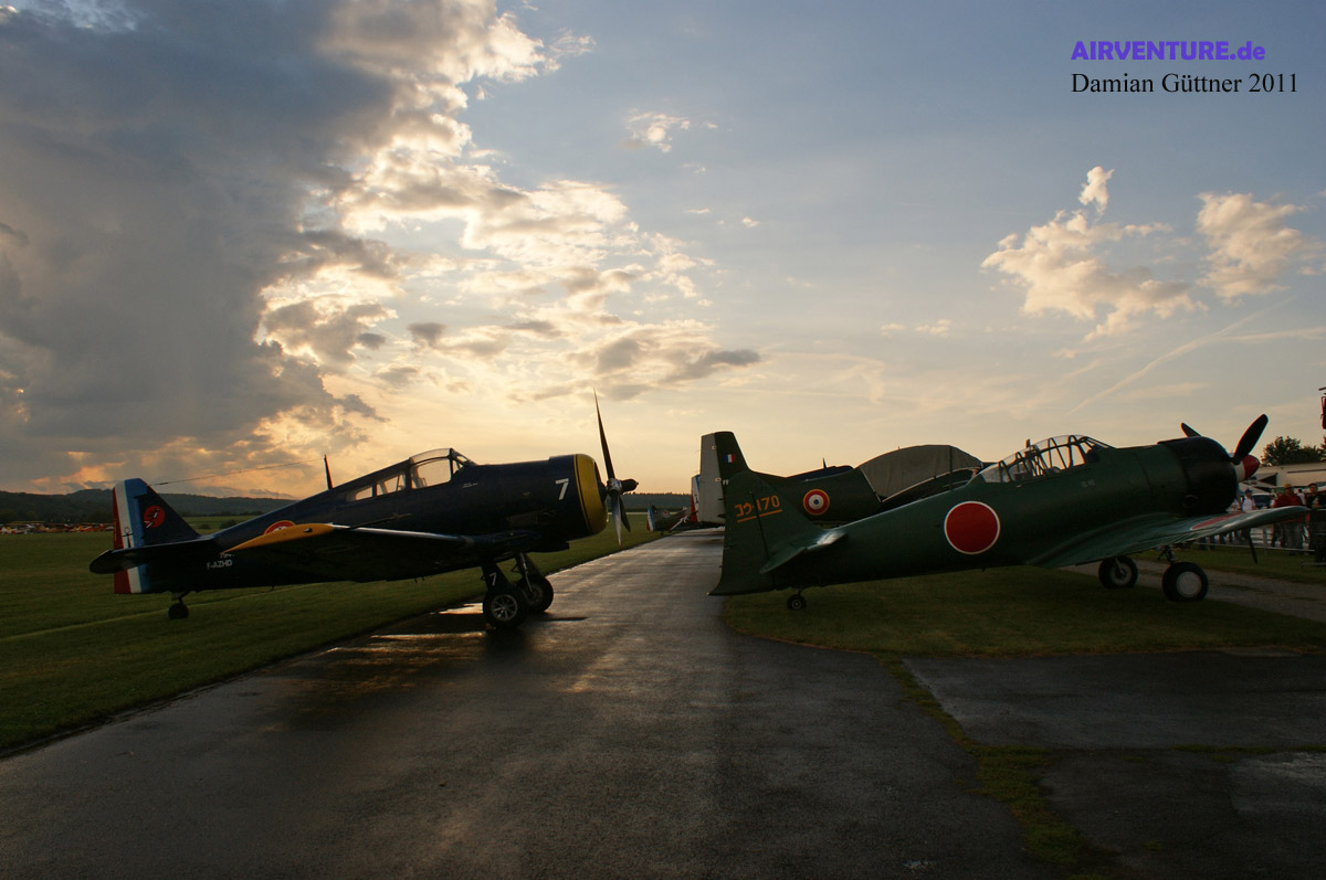 Eine schöne Abendstimmung mit zwei North-American Varianten der Salis Collection aus La Ferté Alais die zeigen, wie vielseitig die Texan/Harvard Trainer sind. |