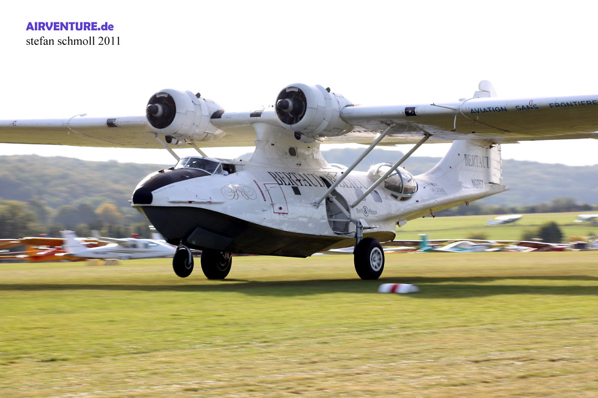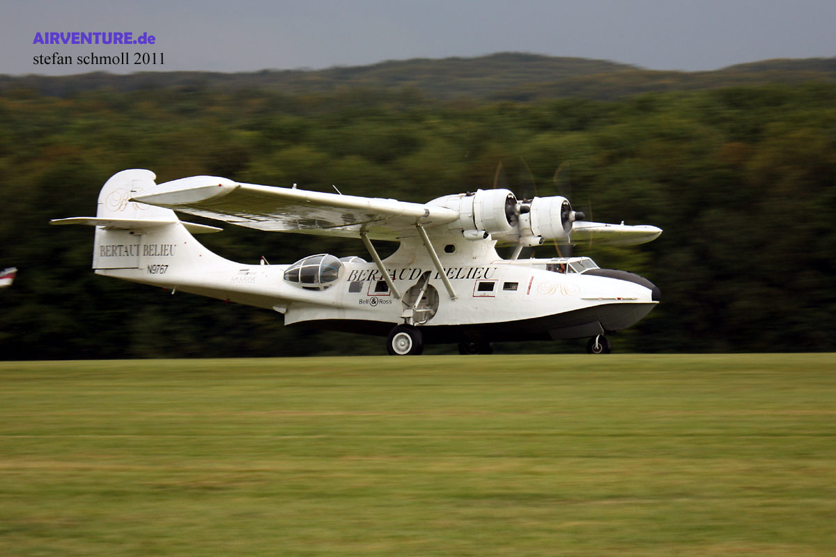 Kaum kleiner als die NORD Noratlas ist das Amphibienflugzeug Consoldated Catalina. Es ist schon sehr beeindruckend, das riesige Flugzeug auf der kleinen Graspiste starten und landen zu sehen. Beheimatet ist die N9767 in Melun bei Paris. |