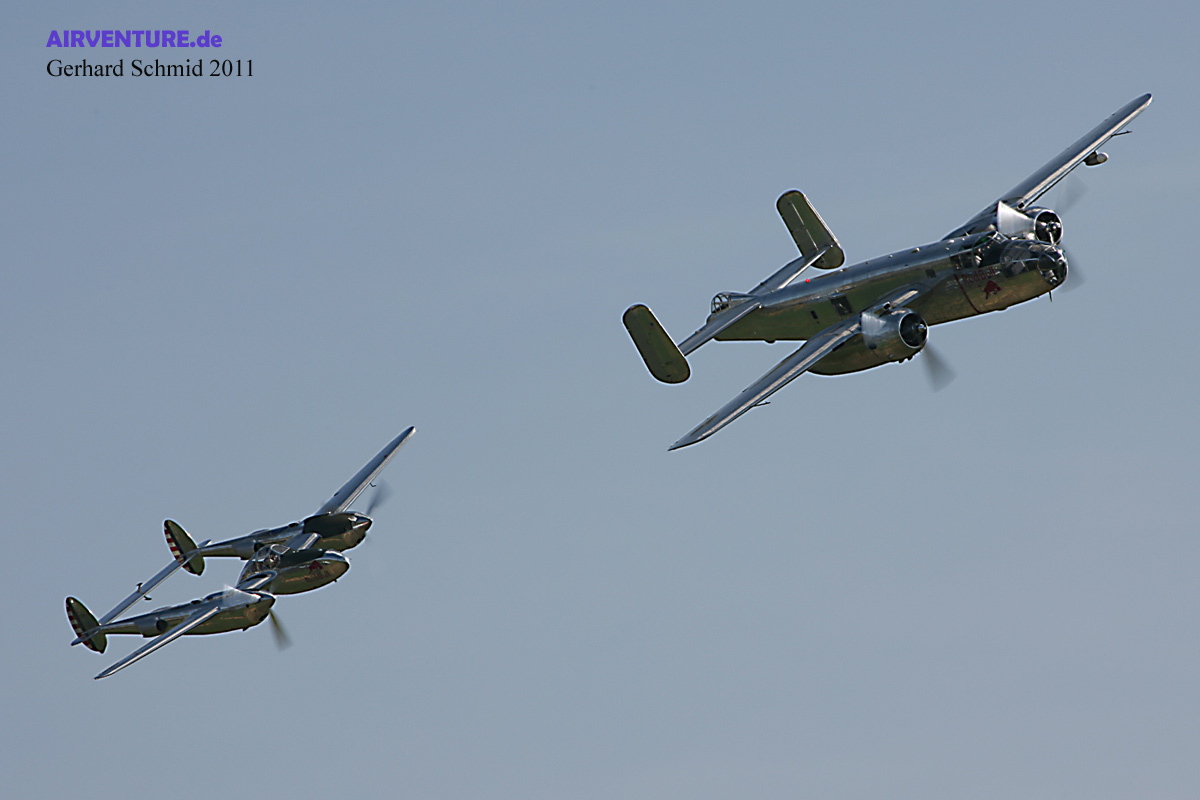 Wie geplant kamen jedoch die Flying Bulls erstmals auf die Hahnweide. B-25 Mitchell und P-38 Lightning operierten vom benachbarten Flughafen Stuttgart aus und kamen sowohl Samstag als auch Sonntag zum Display rüber. Die blank polierten Maschinen waren ein herrlicher Kontrast zum blauen Himmel. |