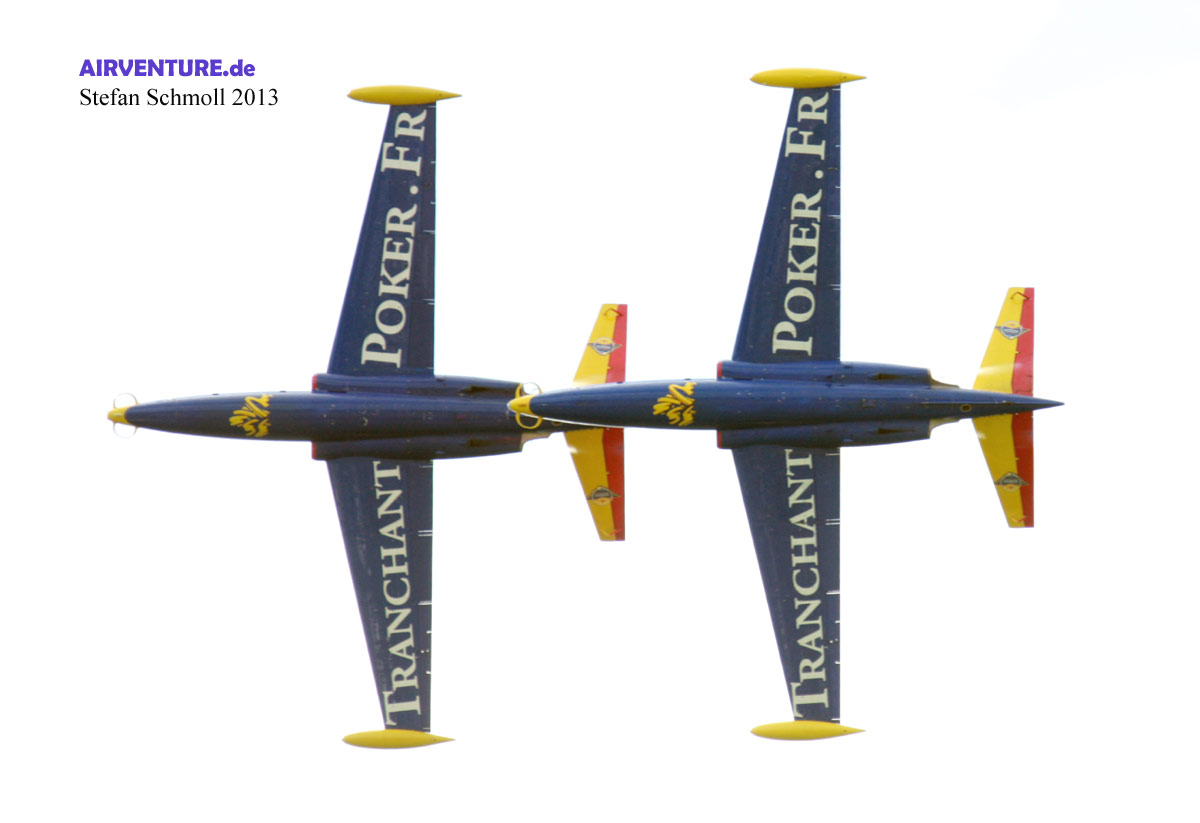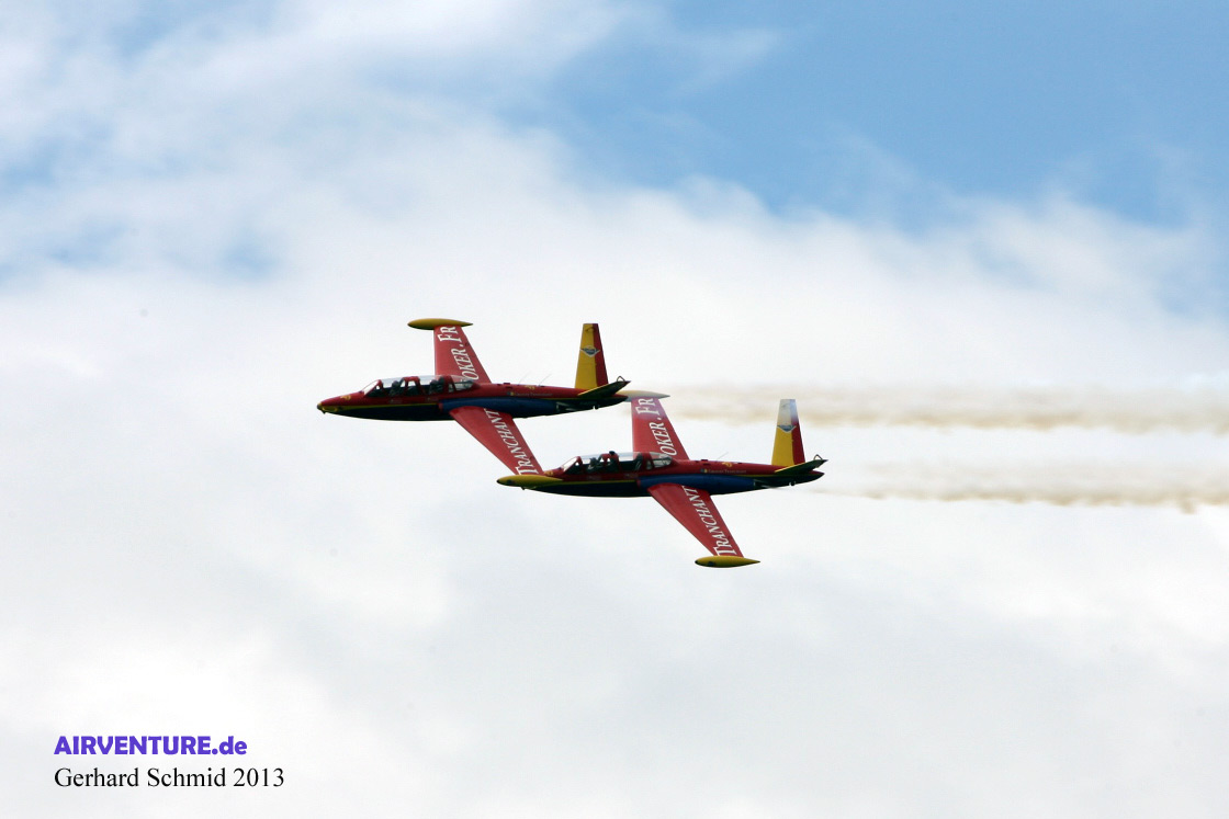 Erstmals hat Hans Puskeiler mit der http://www.patrouille-tranchant.com/ eine mit Jets ausgerüstete Kunstflugstaffel für das Oldtimertreffen organisiert. Zwei der insgesamt vier Maschinen aus dem französischen Rennes zeigten eine tolle Formationsvorführung.
