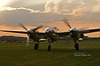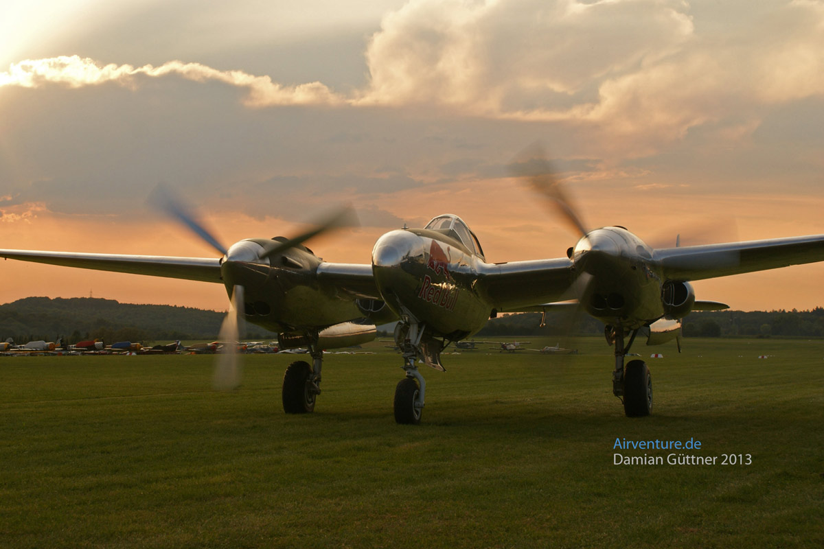 Die P-38 L ist das Schmuckstück der Red Bull Flotte aus Salzburg. Hier rollt die Maschine, von der Tankstelle kommend, im abendlichen Sonnenuntergang zum Abstellplatz. Es ist der einzige "Gabelschwanzteufel", der in Europa fliegt.