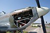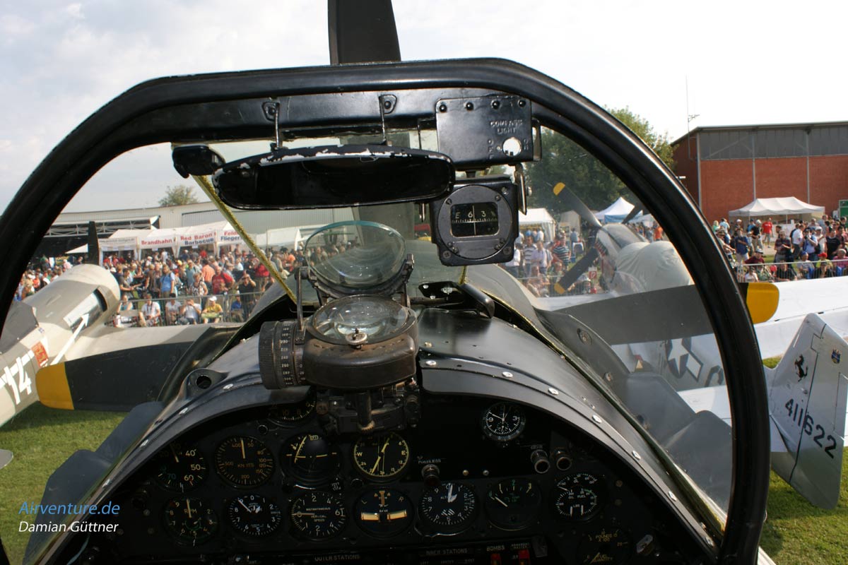 Das Cockpit der Douglas AD 4N Skyraider ist noch ein richtiger, alter Uhrenladen, in dem der Pilot auf die heutigen MFD und HUD Displays verzichten muß. Zum größenvergleich der Maschine ist der Steuerknüppel relativ klein ausgefallen.