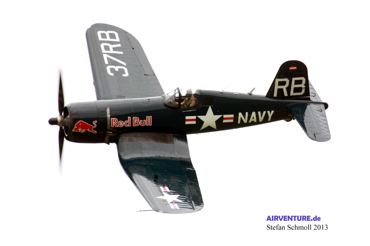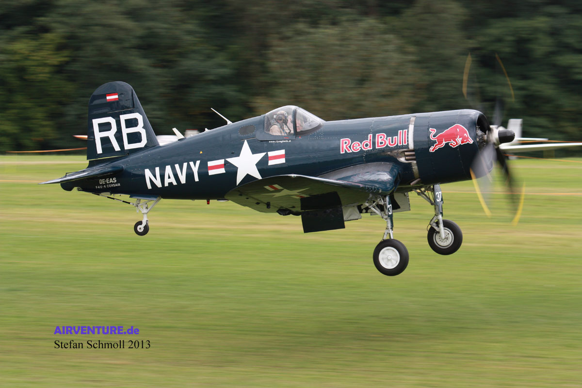Schöner Start der F4U4 Corsair geflogen von Eric Goujon. Diese Maschine gehört der Red Bull Sammlung aus Salzburg. Es wurden ca. 12.000 Maschinen dieses Typs gebaut, davon fliegen ca. 5 in Europa.