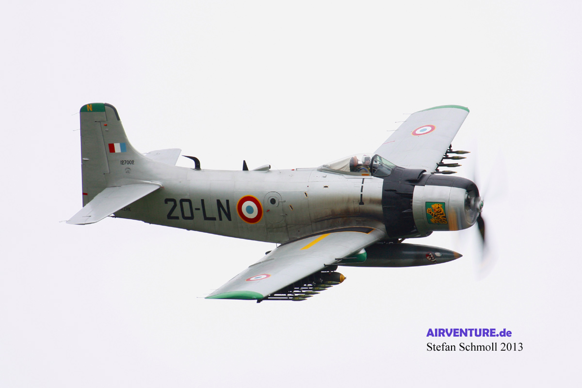 Zum dritten Mal war eine Douglas AD 4N Skyraider auf der Hahnweide. Und es war niemals die gleiche. Zum ersten Mal kam eine Skyraider 2003 auf die Hahnweide, 2009 dann die bekannteste AD 4N mit der Wespe auf dem Leitwerk und dieses Jahr kam diese 1951 gebaute, waffenstrotzende Skyraider aus Avignon.