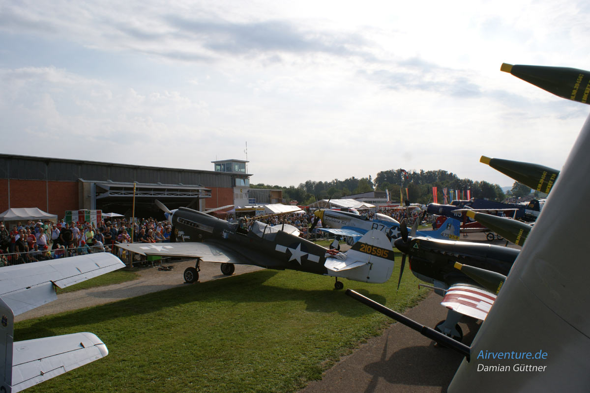 Die P-51 D Mustang fährt kurz nach dem Start das Fahrwerk ein. Diese Maschine ist neu am Europäischen Air Show Himmel. Willi Heinz aus Albstadt-Degerfeld hat sie im Dezember 2012 in den USA gekauft und bereits im Januar 2013 wurde sie in einem Container nach Deutschland transportiert. Am 1. Mai 2013 hat das Flugzeug den ersten Flug mit dem neuen Besitzer absolviert.