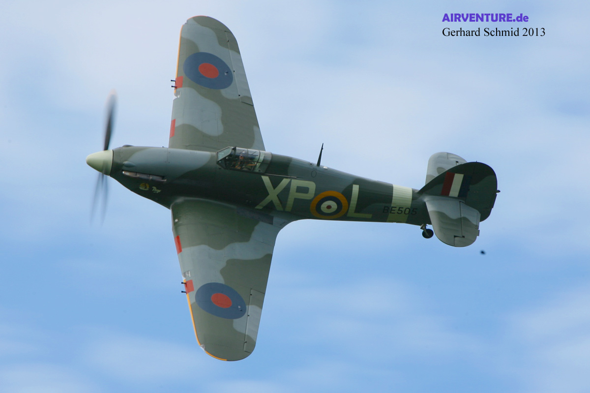 Der englischer Warbirdsammler Peter Teichmann brachte diese schöne Hawker Hurricane Mk II B zur diesjährigen Hahnweide Air Show. Diese Maschine ist eine Kanadische Lizenzproduktion aus dem Jahr 1942. Es ist ein seltener, sogenannter "Hurribomber", weil er zusätzliche Bordwaffen im Außenflügel hat und Bombenschlösser unter den Flügeln.