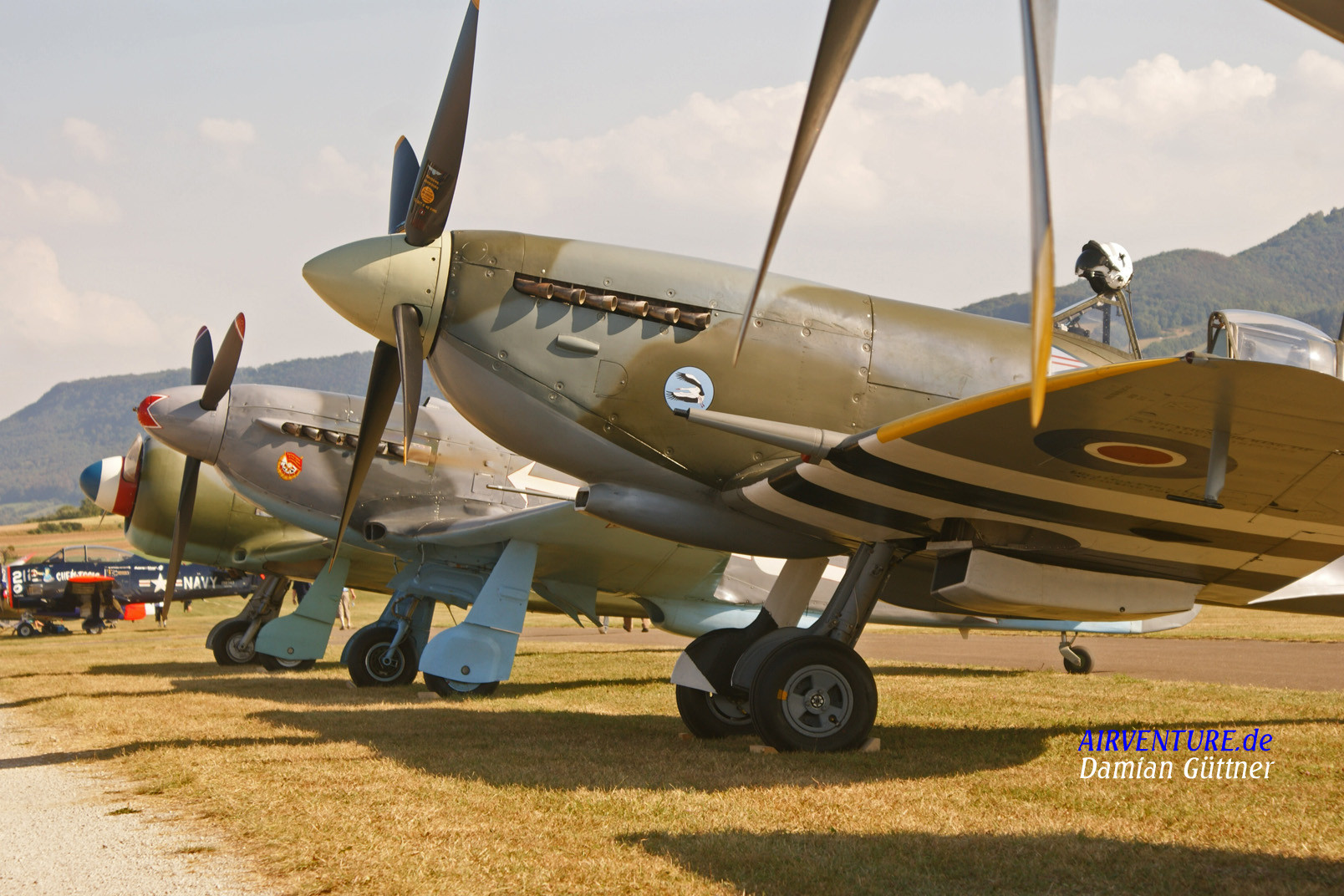 Die Flightline in der Nachmittagssonne. Im Vordergrund die Spitfire Mk XVI von Stephen Stead, dahniter seine Jak 3 und ganz hinten eine Jak 11 von Stefano Landi aus Italien. Die Spitfire hat Lackierung von einer tschechischen Einheit. Ganz hinten steht die neue Errungenschaft von Toni Eichhorn , die T-28 .