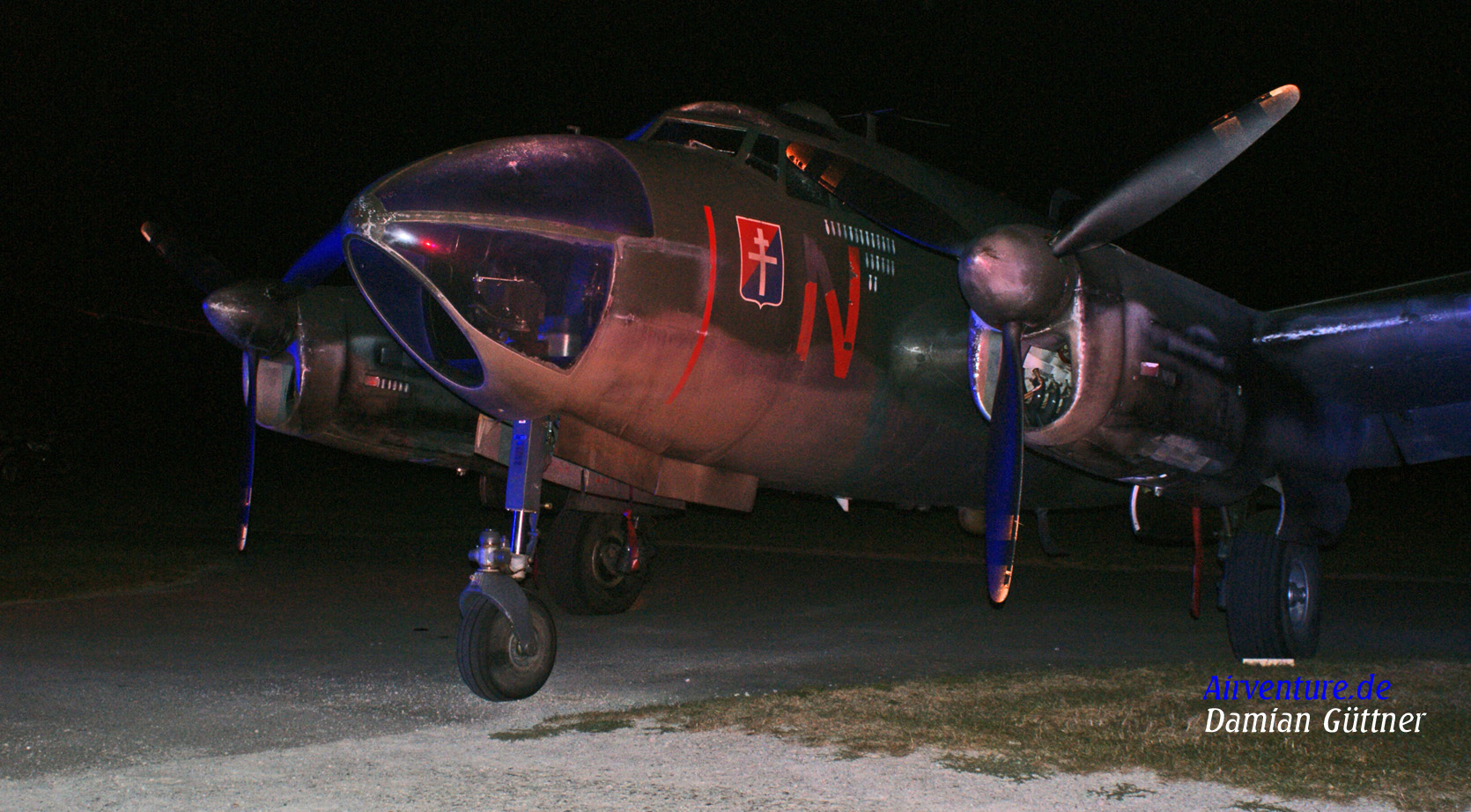 Eine schöne MD 311 Flamant Bomber Version, Bj. 1951. Dieser Typ wurde Ende des II WK entwickelt, kam aber erst nach dem Krieg in Produktion. Von der Bomberversion wurden nur 39 Maschinen gebaut. Diese Maschine kam zur Hahnweide kurz nach Drehschluß zu einem II WK Film, lackiert ist es nach einem A- 20 Boston Vorbild. Das Foto entstand ca. 2.00 in der Nacht.
