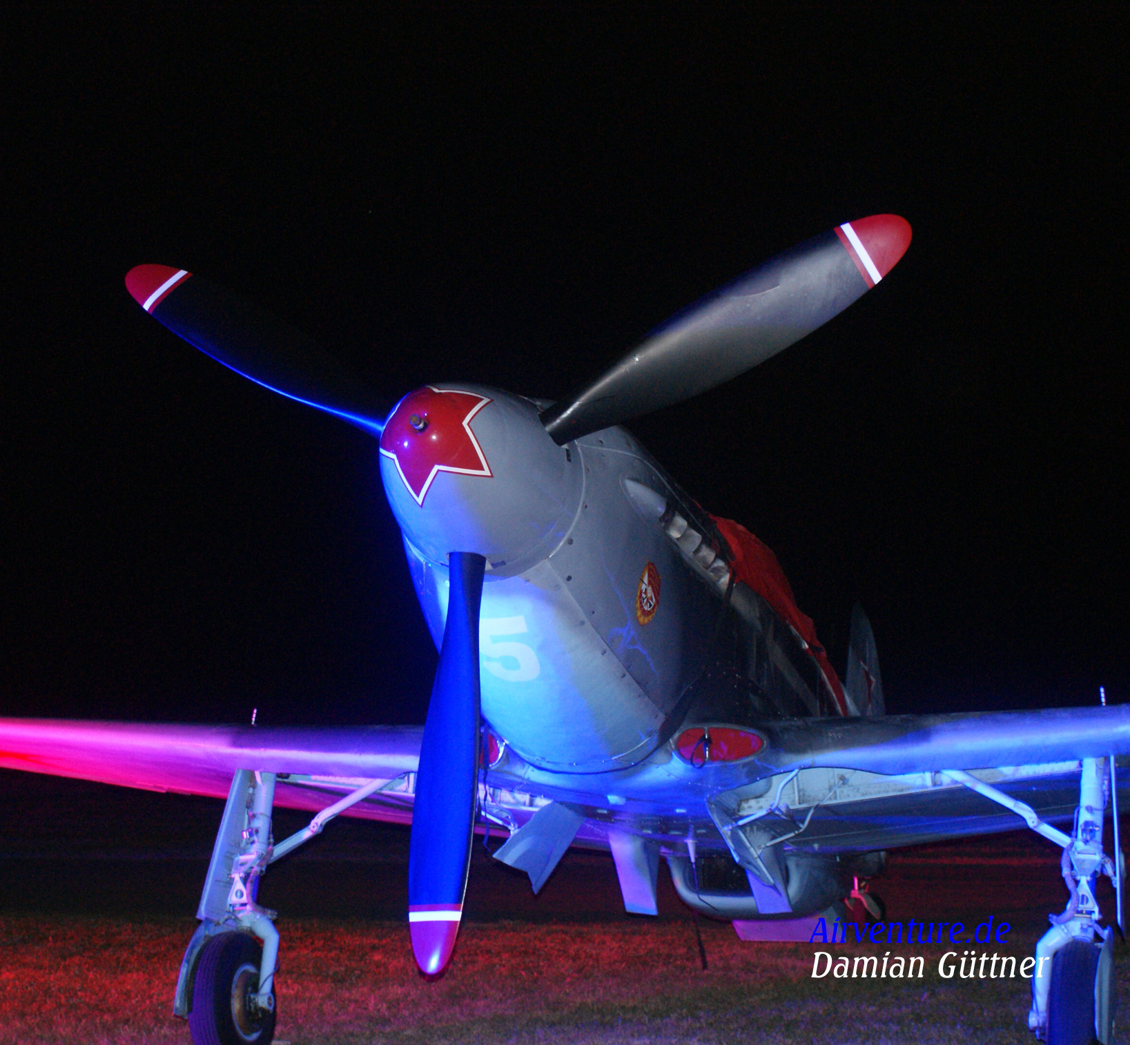 Jak 3 bei Nacht. Einer der Hahnweide Highligts ist die beleuchtete Flightline am Abend bis spät in die Nacht. Dabei werden mehrere Scheinwerfer und Nebelwerfer hinter den Maschinen aufgebaut um den Zuschauern schöne Fotomotive bei Nacht zu ermöglichen.