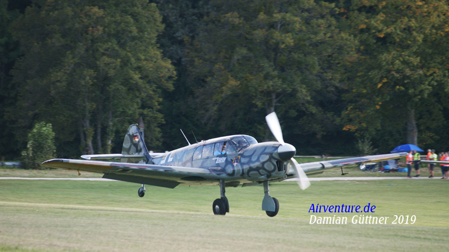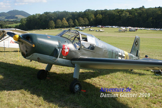 Ankunft einer Nord 1002 aus Aalen - Elchingen. Diese Maschine stammt aus französischer Lizenzproduktion und wurde 1945 gebaut. Während des Krieges wurde die Produktion der Bf 108 nach Frankreich verlagert , später, wegen Ersatztelemängel des Argus AS 10 Triebwerks, wurde ein französisches, linksdrehendes Renault 6Q-10 Triebwerk eingebaut und die Bezeichnung von Bf 108 auf Nord 1002 gewechselt. Diese Maschine war mehrere Jahre in Villingen- Schwenningen stationiert und kurz vor der Veranstaltung von Karl Grimminger gekauft worden.