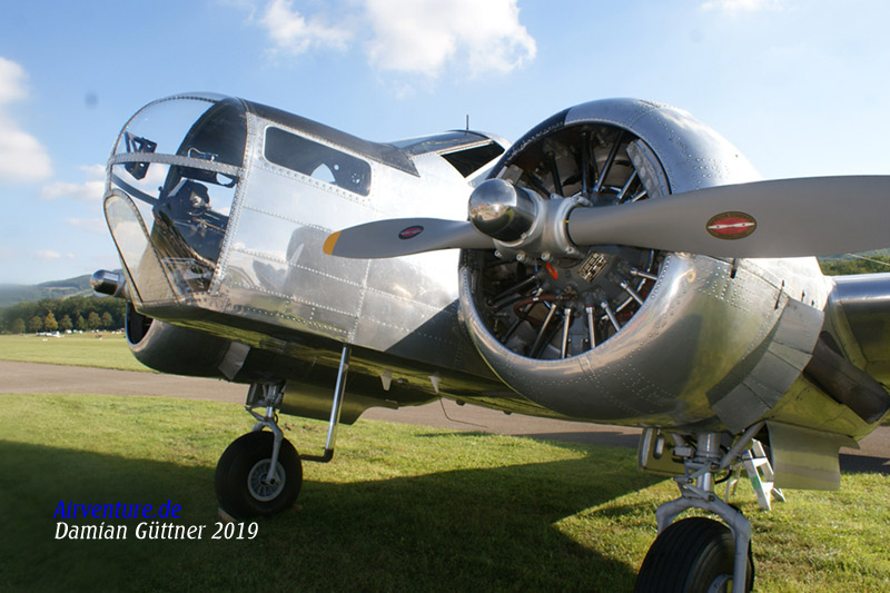 Eine seltene, kurz vor der Veranstaltung in Deutschland eingetroffene Beechcraft AT-11 Kansan, Bj. 1943 aus der Sammlung von Karl Grimminger. Dieser Typ ist eine Weiterentwicklung der Beach 18 zur einem Bomber-Trainer mit verglaster Nase, Bombenzielgerät und einem Bombenschacht im Rumpf.
