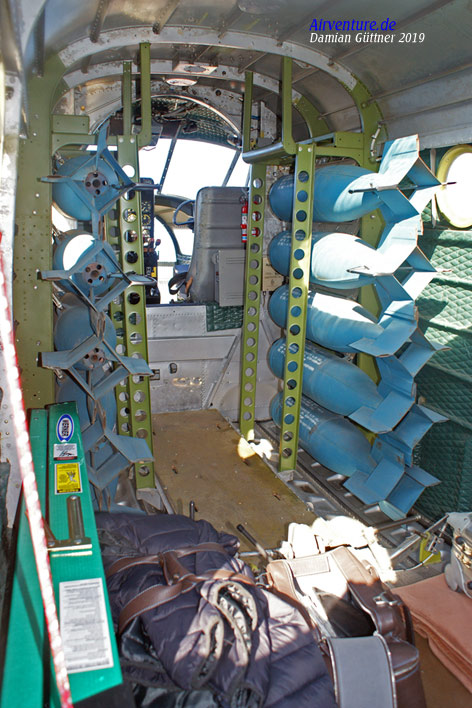 Ein Blick in den Rumpf der Beechcraft AT-11 Kansan, mit dem Bombenschacht und Übungsbomben. Alle Übungswaffen werden zur besseren Identifizierung blau gekennzeichnet um Verwechslungen zur vermeiden.
