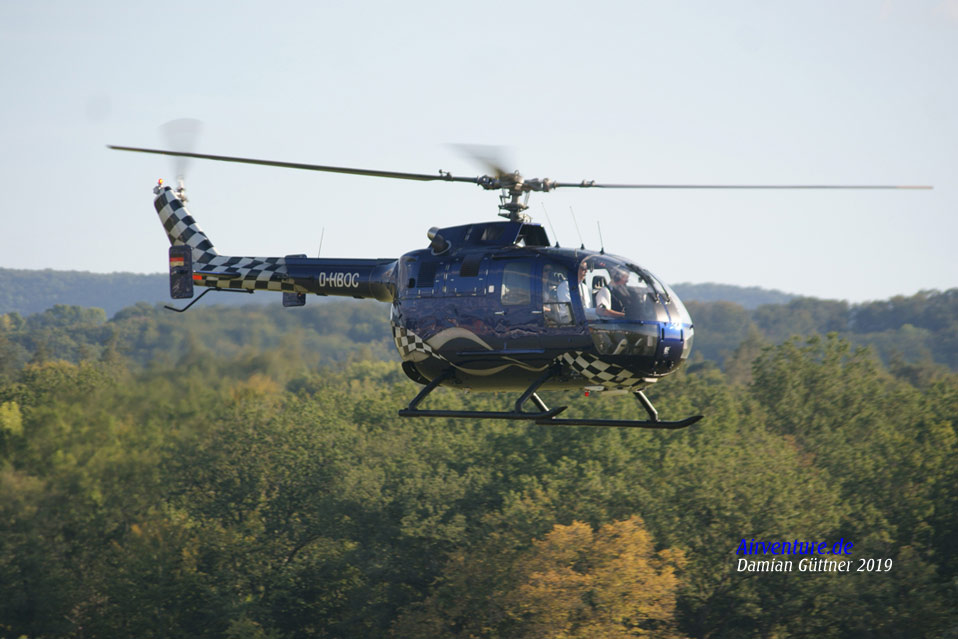 Ein kurzer Besuch einer Bo 105 mit einigen Überflügen. Hubschrauber sind eher die Seltenheit auf der Hahnweide, aber auch eine Bereicherung für die Zuschauer. Es ist ein ehemaliger Polizei Hubschrauber der in Stuttgart, Baden - Württemberg stationiert war und heutzutage in Privatbesitz ist und in Bamberg stationiert ist.