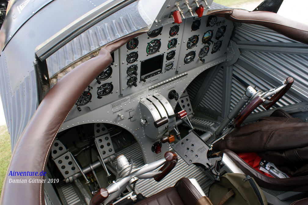Da es ein Neubau ist, wurde das Cockpit mit modernen Instrumenten ausgestattet, dazu wurde ein moderner Funk und ein GPS Gerät eingebaut. Aber die Piloten dürfen mit alten Steuersäulen - Replikas fliegen.