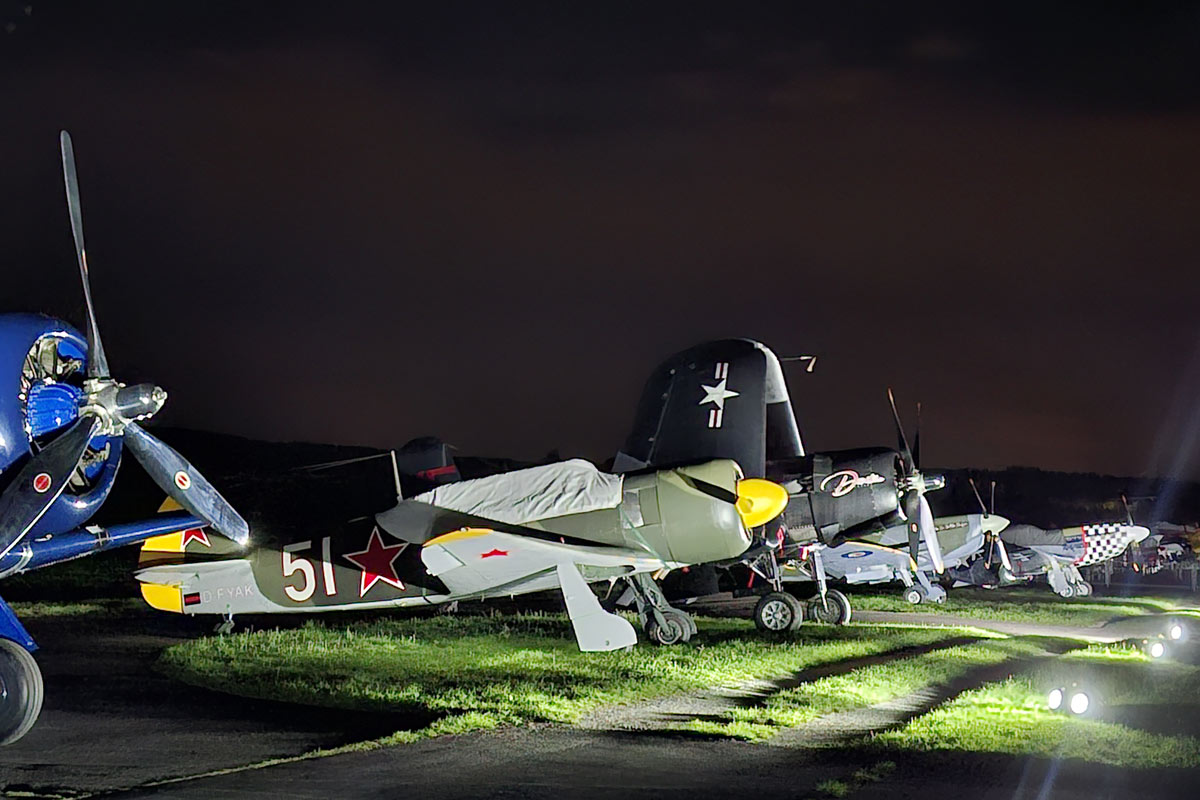 Auch die abendliche Beleuchtung der Flightline gehört zu den Besonderheiten des Oldtimertreffens. Schließlich feiern viele Teilnehmer und Besucher bis spät am Abend und übernachten auch hier am Platz. |