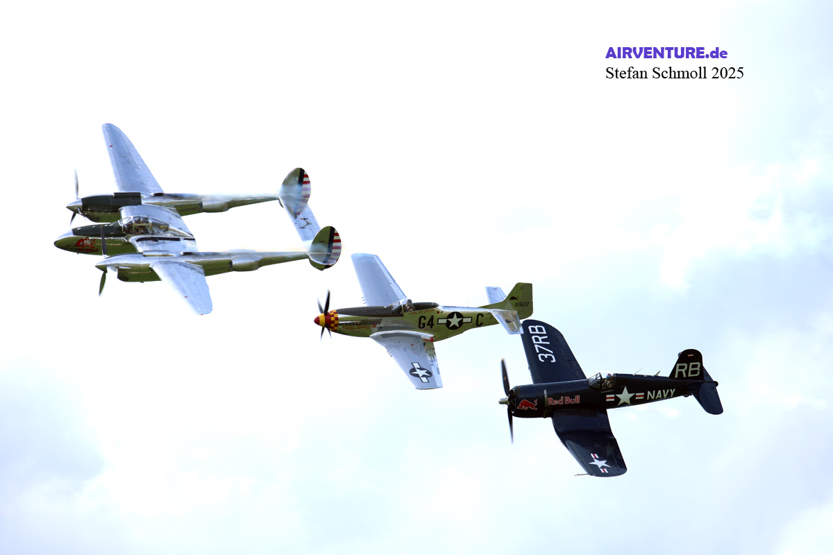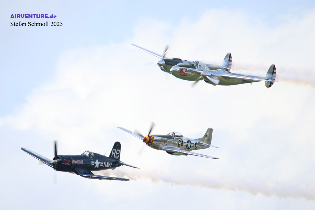 In der Saison 2026 kommt erstmals neben diesen drei amerikanischen Ikonen die in Farben der "Blue Angels" lackierte Grumman Bearcat mit zum Einsatz. Man darf gespannt sein, wie sich die Flying Bulls dann präsentieren. Zusätzlich macht sich die Lockheed P-38 gemeinsam mit der mächtigen Douglas DC-6 auf eine große Reise: Im Juli 2026 geht's über den Atlantik nach Oshkosh zum legendären Airventure! |
