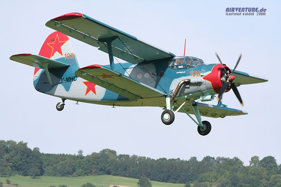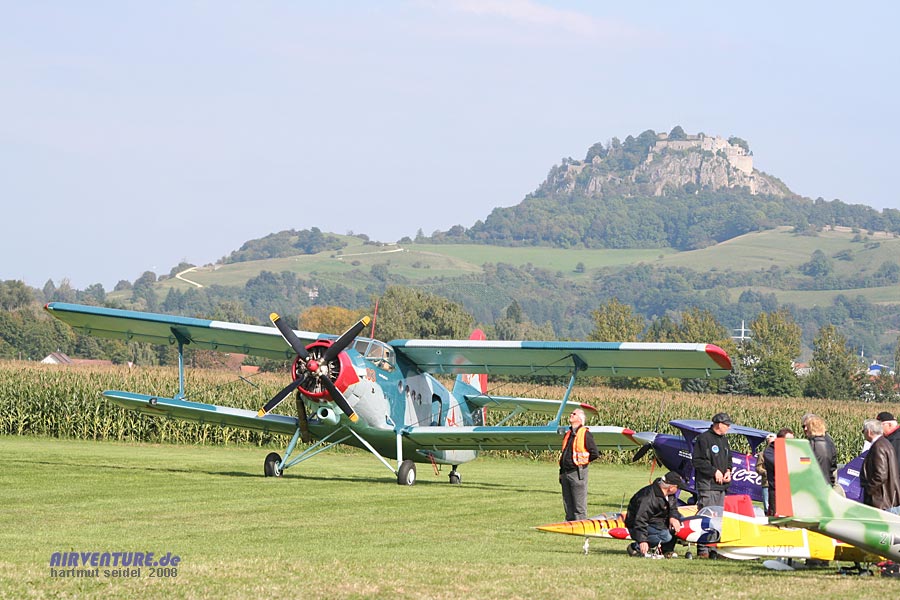 Die flugbegeisterten Besucher des Internationalen Flugtag 2008 in Hilzingen hatten vor Ort auch die Möglichkeit, mit mehreren verschiedenen Luftfahrzeugtypen kostengünstige Rundflüge durchzuführen. Eine der Rundflugmaschinen war dieser Antonov An-2 Doppeldecker des schweizerischen Vereins Starflight Switzerland ( www.starflight.ch ). |