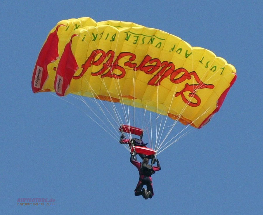 Zum Flugprogramm des Internationalen Flugtag 2008 in Hilzingen gehörte auch das Absetzen von Fallschirmspringern. Diese beiden Springer vom Zoller-Hof-Team des Fallschirmsportclub Pfullendorf führen gerade einen Kappenformationssprung durch. |