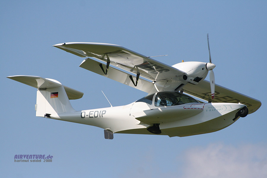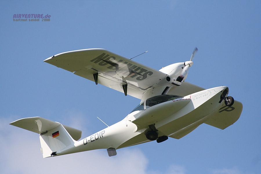 Neben den vielen in unserem Bericht schon gezeigten sehr interessanten Oldtimermaschinen war beim Internationalen Flugtag 2008 in Hilzingen aber auch ein ganz neues und modernes Flugzeug vor Ort : Die S-Ray 007 von Iren Dornier, dem Enkel des berühmten Flugzeugkonstrukteurs Dr. Claude Dornier. |