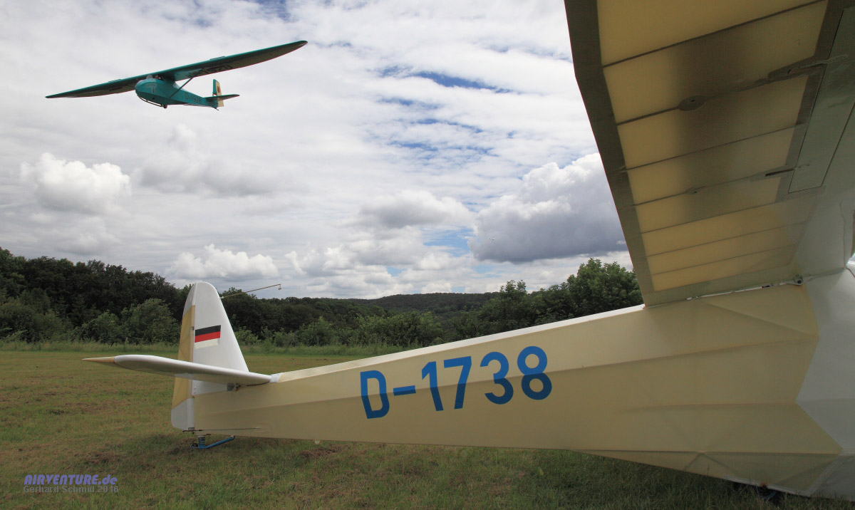 Der Einladung zum "kleinen Holzfliegertreffen" des Aeroclub Göppingen-Salach sind unter Anderem Mitglieder des VFhS e. V. (Verein zur Förderung des historischen Segelflugs) und des Vintage Glider Club mit etwa einem Dutzend privater und Vereins-Segelflugzeuge aus den 30er bis 60er Jahren gefolgt, die dann auch stilecht mit einer Piper Super Cub, alternativ auch per Seilwinde in den Himmel gezogen wurden. Letzterer zeigte sich lediglich am Sonntagmittag ein paar Stündchen gnädig. Dem Spaß der Flieger tat das keinen Abbruch. Und sogar ein paar Besucher haben sich am Rand der Flugplatzwiese eingefunden um die alten Schätzchen in ihrem Element zu bewundern.