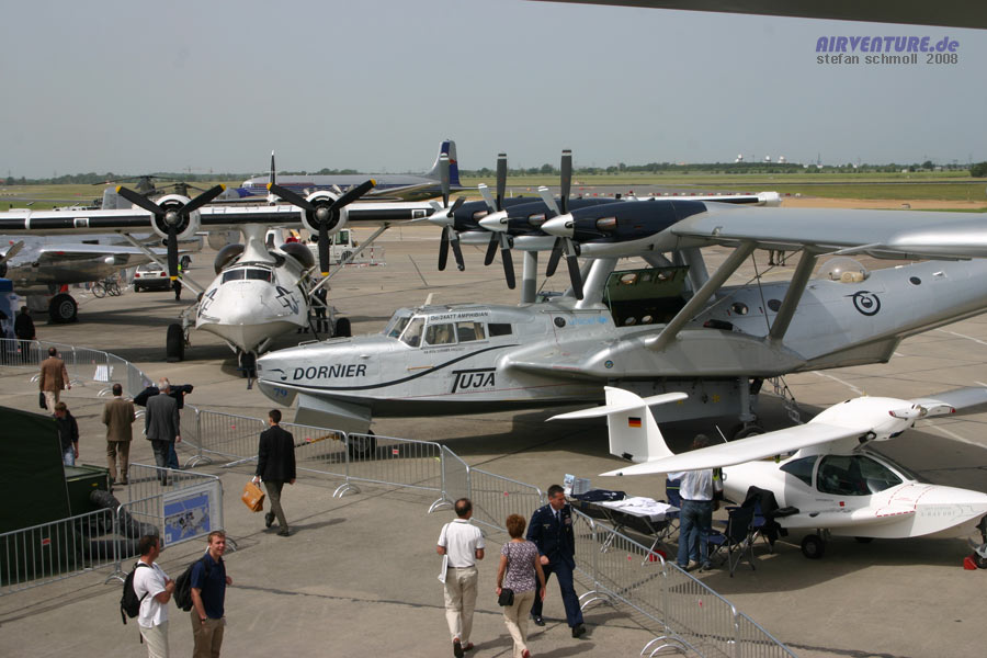 Aber auch am Boden in der statischen Schau sind die Flugboote beeindruckend. Die Do 24 wird von einer in Großbritannien stationierten Catalina und der neuen Ausführung von Dorniers berühmter "Libelle" eingerahmt. |