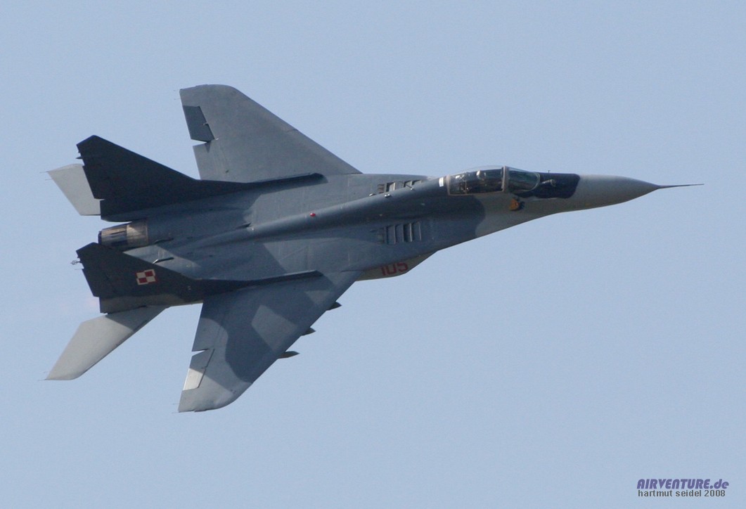 Ein echter Überraschungsgast auf der ILA 2008 war diese Mikojan Gurewitsch MiG-29 der polnischen Luftwaffe, die erst am Freitag-Mittag auf dem ILA-Gelände in Berlin-Schönefeld eingetroffen ist. |