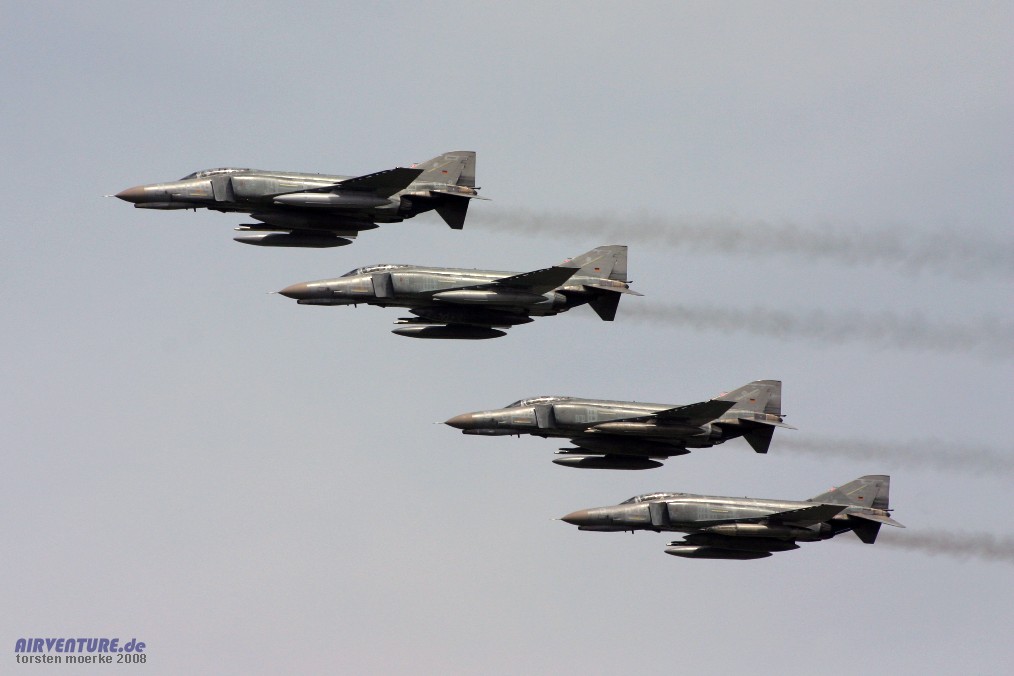 Anläßlich der ILA 2008 war auch diese Viererformation von McDonnell Douglas F-4 F Phantom II der deutschen Luftwaffe zu sehen, die allerdings nicht zur Einsatzdemonstration im Rahmen des Szenarios "Evakuierung aus einem Kriesengebiet" gehörte. Die Phantoms werden bei der deutschen Luftwaffe nunmehr nach und nach durch den Eurofighter abgelöst, daher wird man wohl leider nicht mehr allzu oft wie hier mehrere Phantoms im Formationsflug bewundern können.