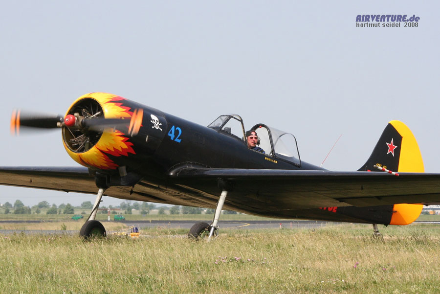 Das "Black Jacks"-Kunstflugteam der FLIEGERREVUE zeigte im Flying Display der ILA 2008 Formationskunstflug mit vier russischen Maschinen. Dieses Foto zeigt eine der beiden Yakovlev Yak-50 des Teams.