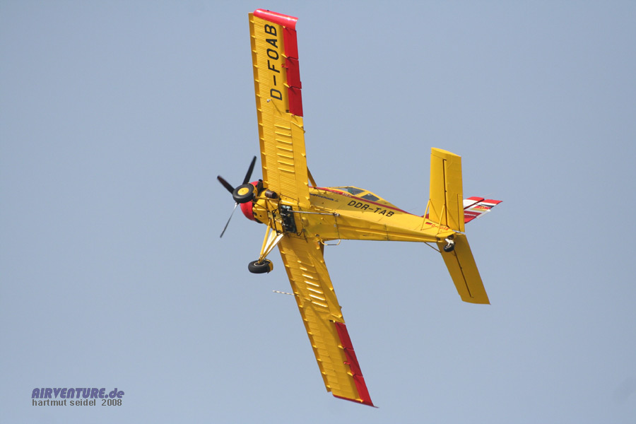 Immer wieder sehenswert sind auch die Flugvorführungen von Dieter Gehling mit dieser Maschine vom polnischen Typ PZL 106 Kruk. Bei der bulligen PZL Kruk handelt es sich um ein Sprühflugzeug für die Landwirtschaft, welches früher bei der Agrarflug-Abteilung der DDR-Fluggesellschaft "Interflug" zum Einsatz gekommen ist.