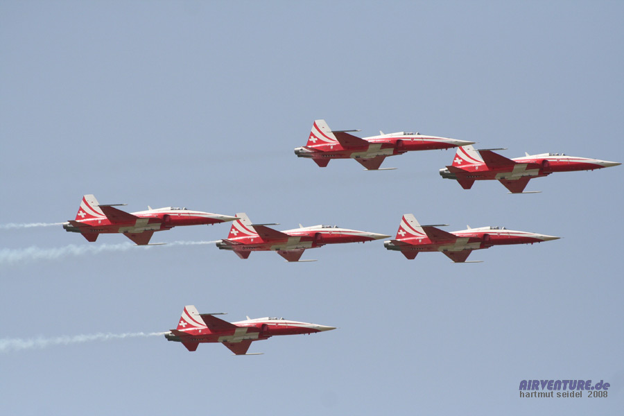 Im ausserordentlich vielseitigen Flugprogramm der ILA 2008 waren auch die Darbietungen von mehreren hochkarätigen Formationskunstflugteams aus dem In- und Ausland zu sehen. Hier startet gerade die berühmte Jet-Kunstflugstaffel "Patrouille Suisse" von der Schweizer Luftwaffe zu einer erstklassigen Flugvorführung. |