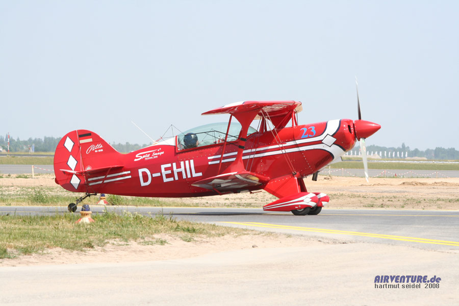 Auch das "Split Image Aerobatic Team" war im Flugprogramm der ILA 2008 vertreten. Das Team fliegt mit zwei kleinen Kunstflugdoppeldeckern : Mit einer Pitts Special S-2S und mit der hier zu sehenden Pitts Special S-2B. |